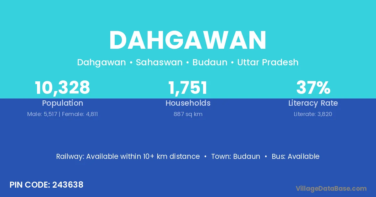 The literacy rate of Dahgawan village is 39.33%. Male literacy stands at 49.34% and female literacy at 28.28%.