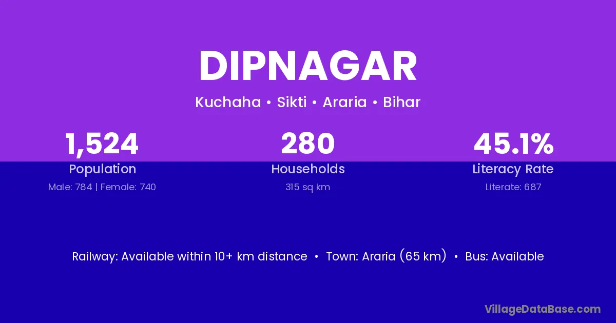 Araria (65 km) is the nearest town to Dipnagar village for major economic activities and is located approximately 65 km away.