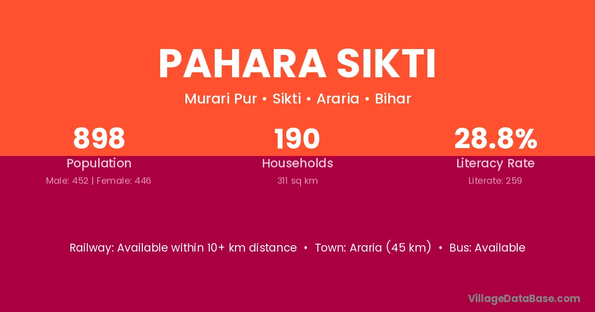 Araria (45 km) is the nearest town to Pahara Sikti village for major economic activities and is located approximately 45 km away.