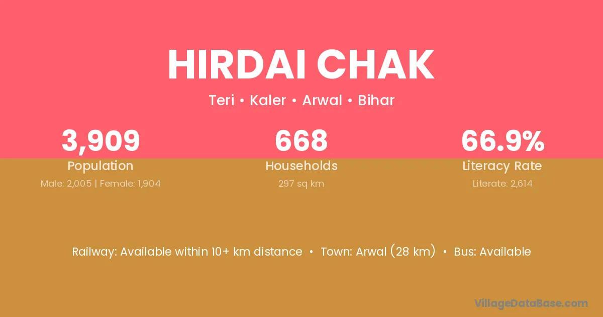 Arwal (28 km) is the nearest town to Hirdai Chak village for major economic activities and is located approximately 28 km away.