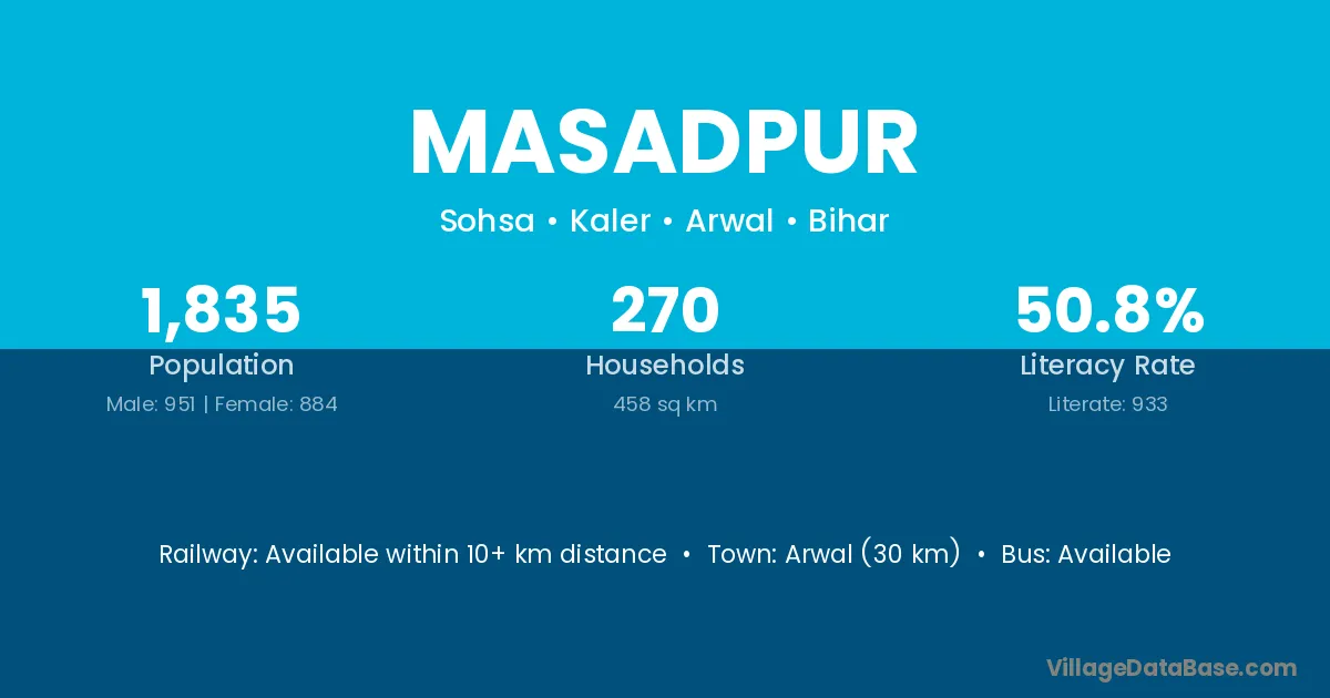 Arwal (30 km) is the nearest town to Masadpur village for major economic activities and is located approximately 30 km away.