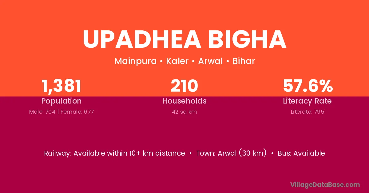 Arwal (30 km) is the nearest town to Upadhea Bigha village for major economic activities and is located approximately 30 km away.