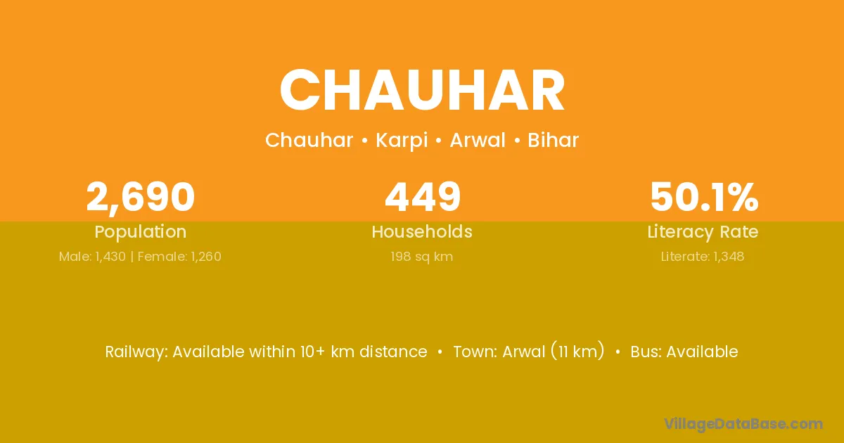 Arwal (11 km) is the nearest town to Chauhar village for major economic activities and is located approximately 11 km away.