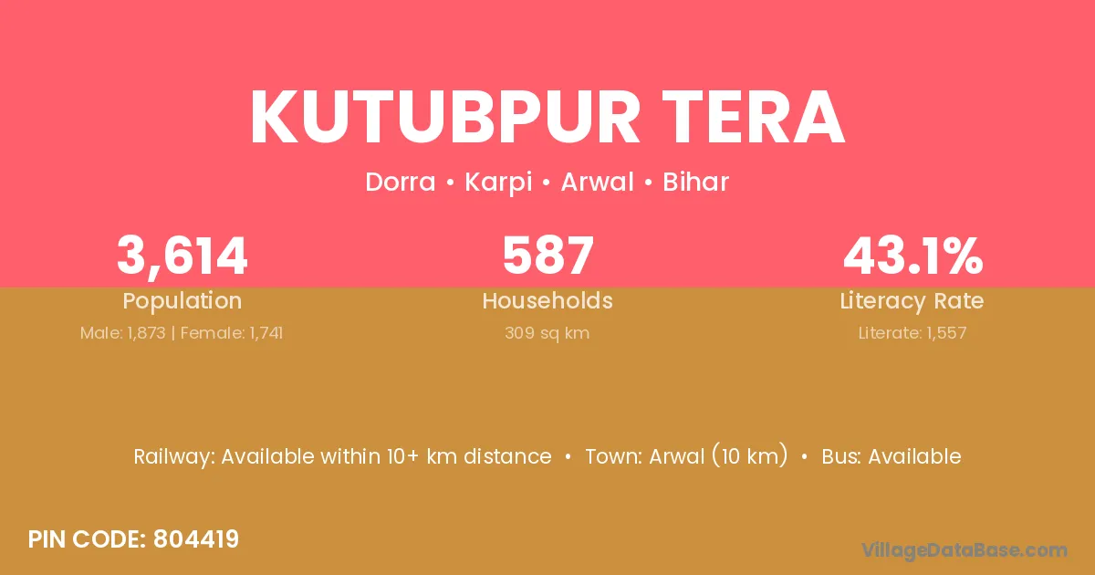 Arwal (10 km) is the nearest town to Kutubpur Tera village for major economic activities and is located approximately 10 km away.