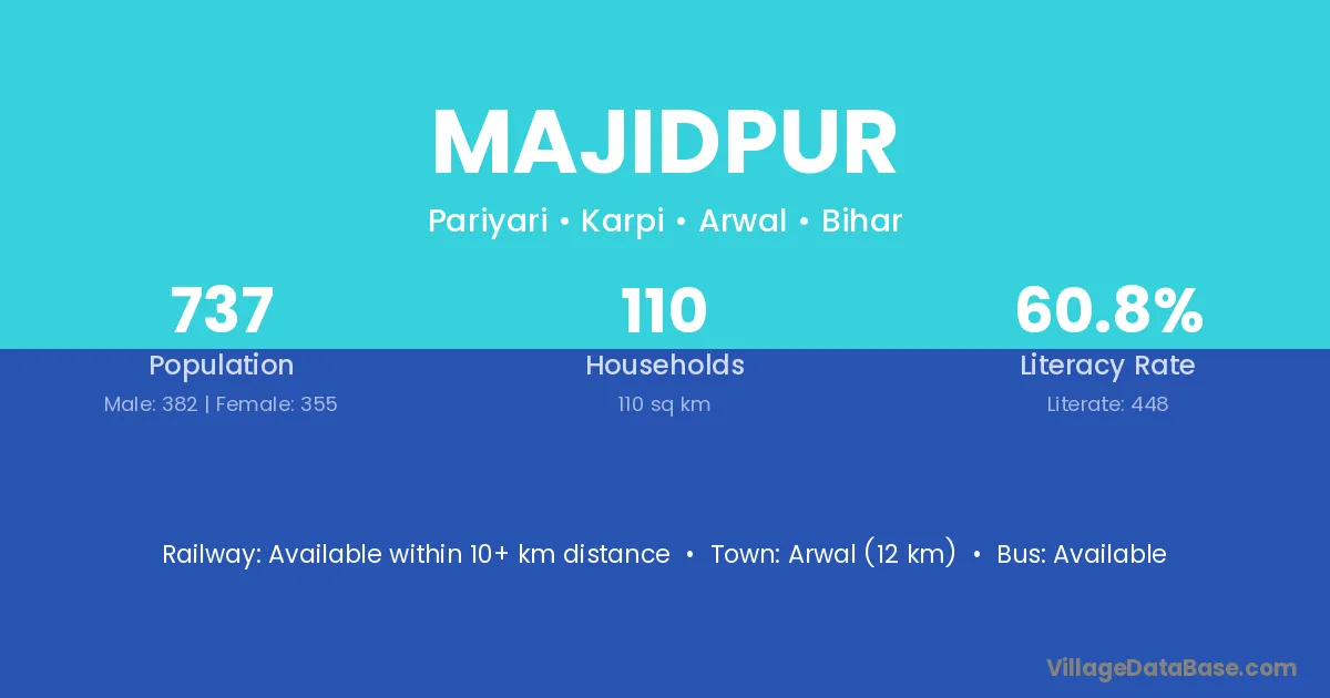 Arwal (12 km) is the nearest town to Majidpur village for major economic activities and is located approximately 12 km away.