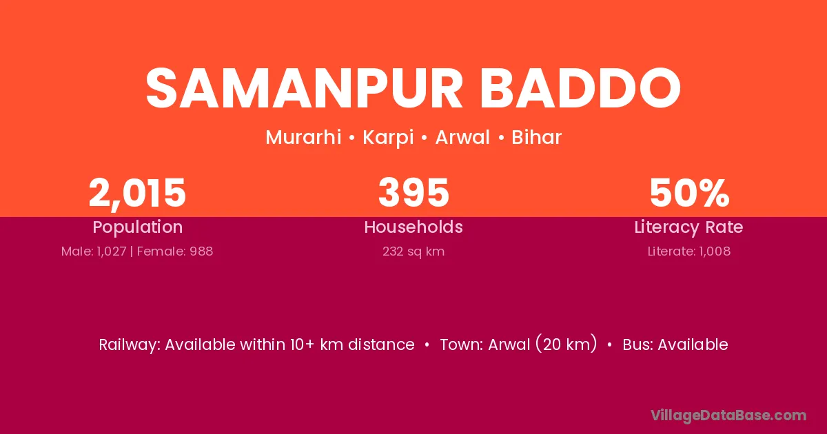 Arwal (20 km) is the nearest town to Samanpur Baddo village for major economic activities and is located approximately 20 km away.