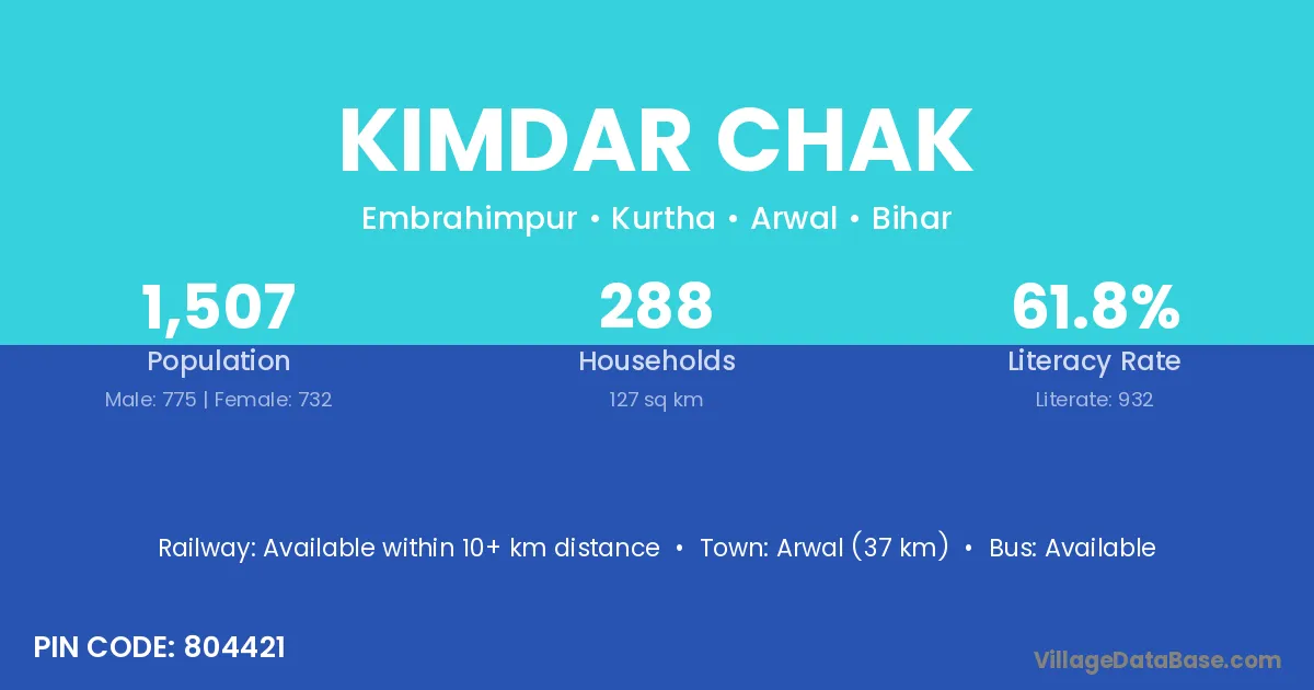 Arwal (37 km) is the nearest town to Kimdar Chak village for major economic activities and is located approximately 37 km away.