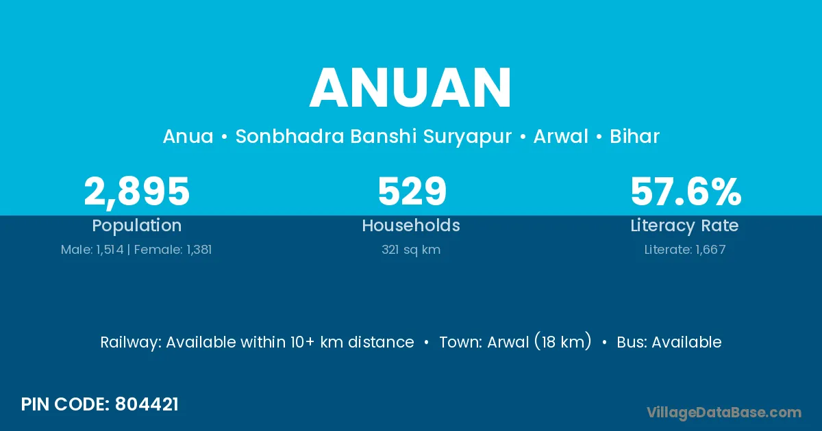 Arwal (18 km) is the nearest town to Anuan village for major economic activities and is located approximately 18 km away.