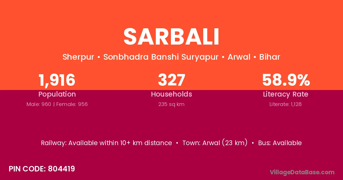 Arwal (23 km) is the nearest town to Sarbali village for major economic activities and is located approximately 23 km away.