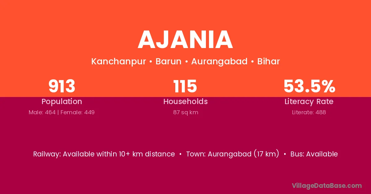 Aurangabad (17 km) is the nearest town to Ajania village for major economic activities and is located approximately 17 km away.