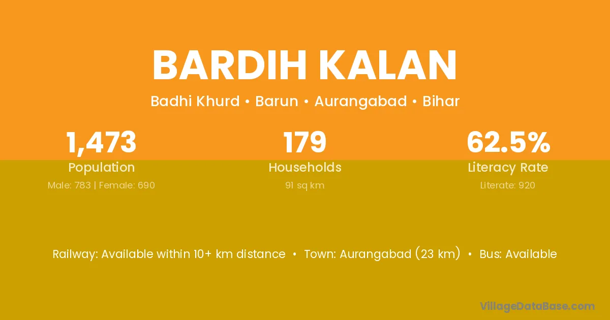 Aurangabad (23 km) is the nearest town to Bardih Kalan village for major economic activities and is located approximately 23 km away.