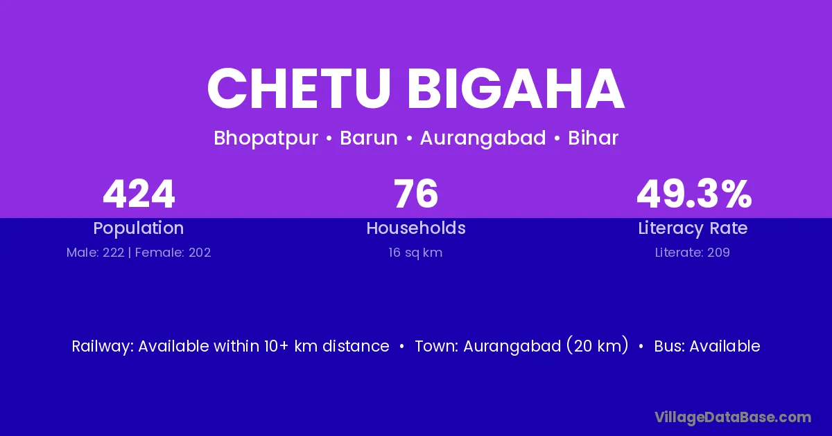 Chetu Bigaha village has a total population of 424 people, of which 222 are males and 202 are females.