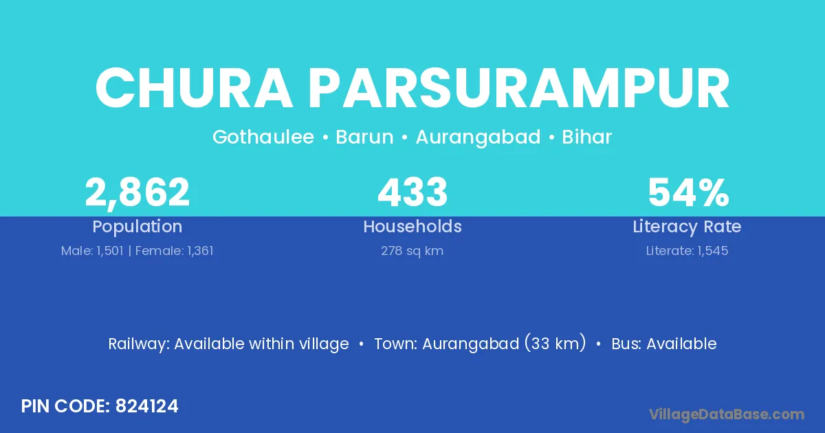 Aurangabad (33 km) is the nearest town to Chura Parsurampur village for major economic activities and is located approximately 33 km away.