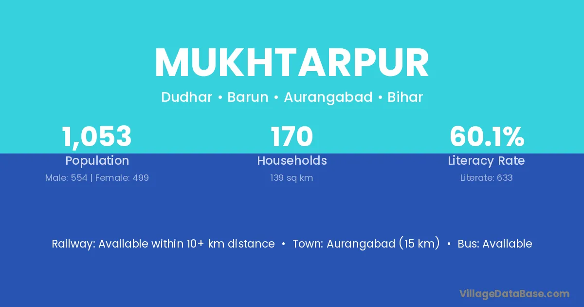 Aurangabad (15 km) is the nearest town to Mukhtarpur village for major economic activities and is located approximately 15 km away.