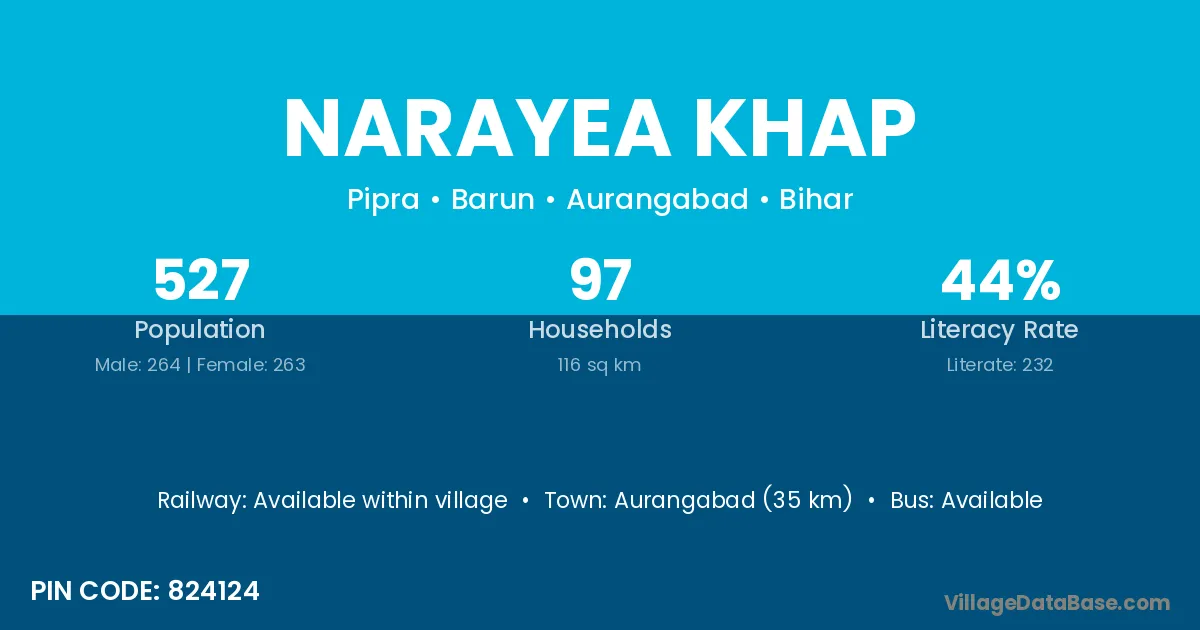 Aurangabad (35 km) is the nearest town to Narayea Khap village for major economic activities and is located approximately 35 km away.