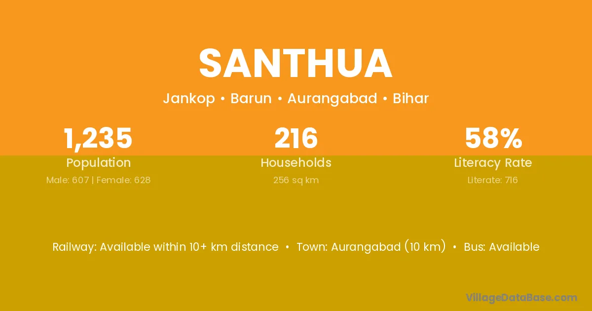 Aurangabad (10 km) is the nearest town to Santhua village for major economic activities and is located approximately 10 km away.