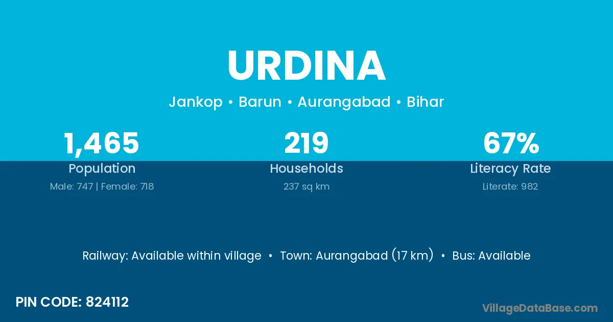 Aurangabad (17 km) is the nearest town to Urdina village for major economic activities and is located approximately 17 km away.