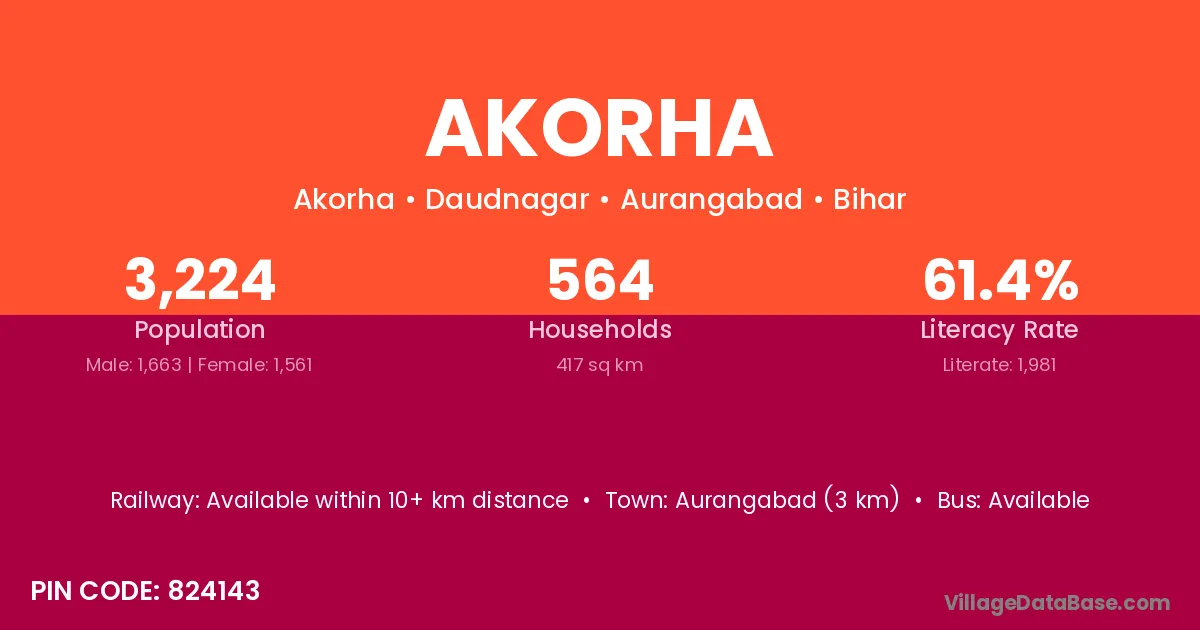 Aurangabad (3 km) is the nearest town to Akorha village for major economic activities and is located approximately 3 km away.