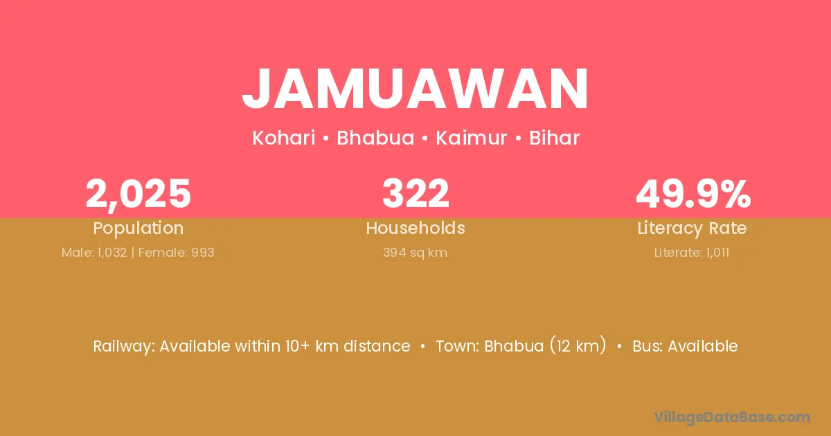 The literacy rate of Jamuawan village is 51.68%. Male literacy stands at 62.05% and female literacy at 40.93%.