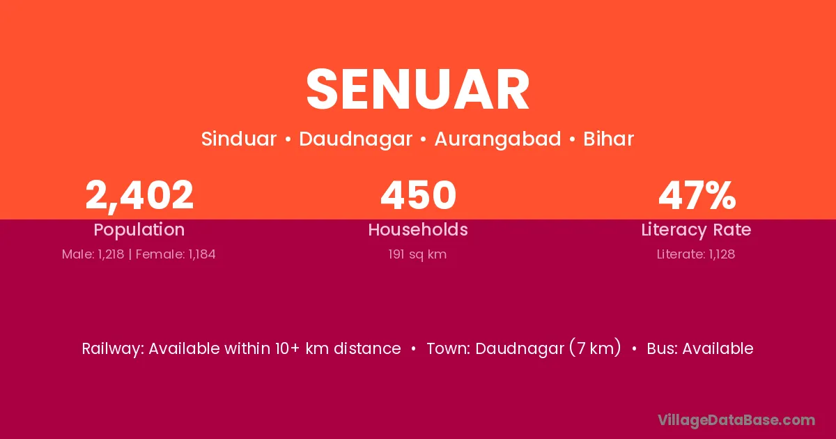 Daudnagar (7 km) is the nearest town to Senuar village for major economic activities and is located approximately 7 km away.