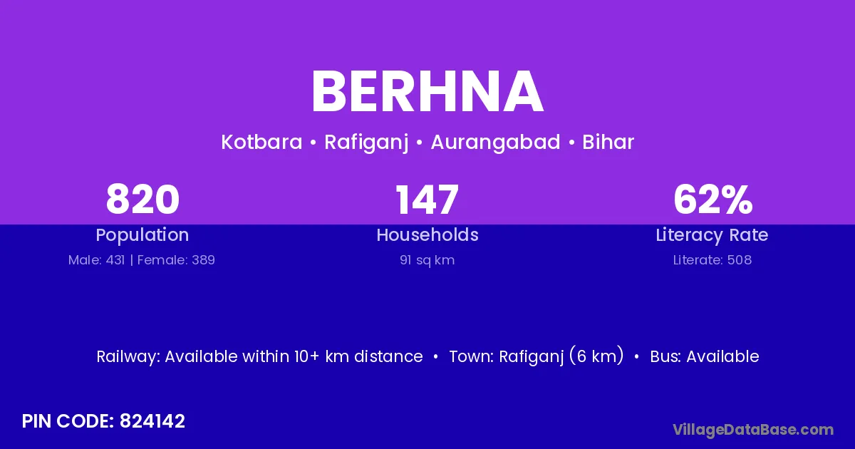Aurangabad (30 km) is the nearest town to Berhna village for major economic activities and is located approximately 30 km away.