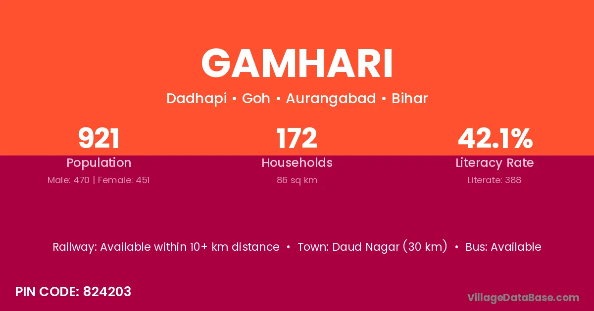 Daud Nagar (30 km) is the nearest town to Gamhari village for major economic activities and is located approximately 30 km away.