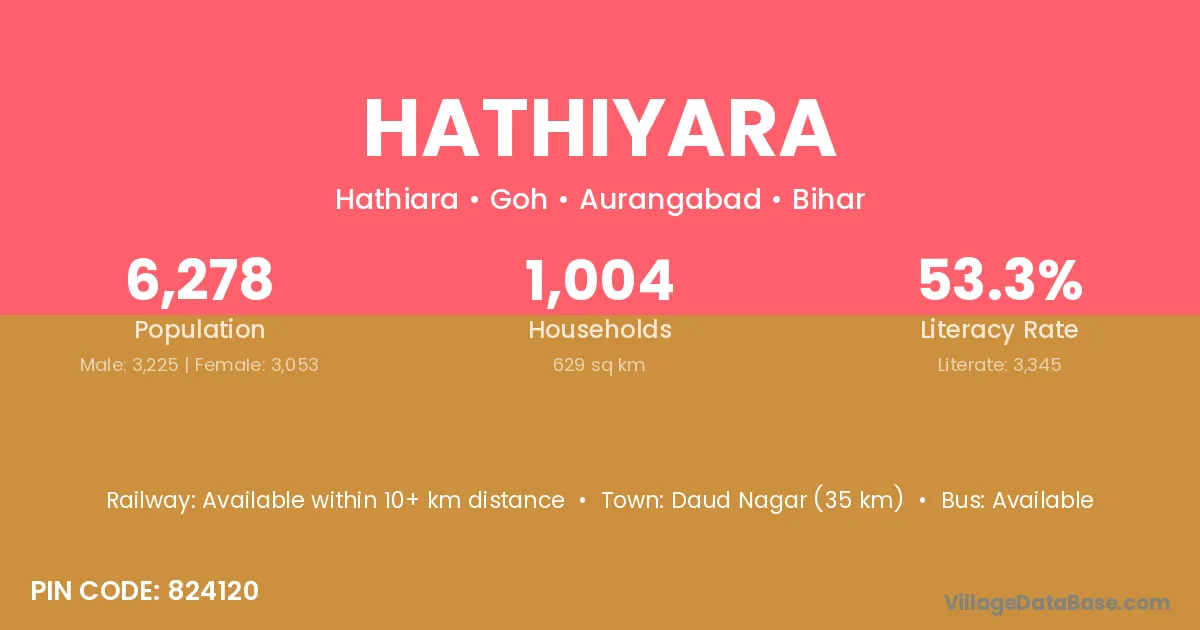 Hathiyara village has a total population of 6,278 people, of which 3,225 are males and 3,053 are females.