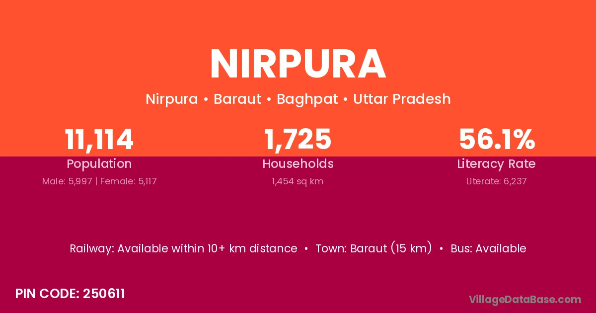 Nirpura village has a total population of 468 people, of which 245 are males and 223 are females.