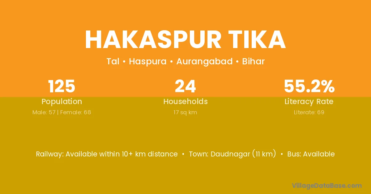 Daudnagar (11 km) is the nearest town to Hakaspur Tika village for major economic activities and is located approximately 11 km away.