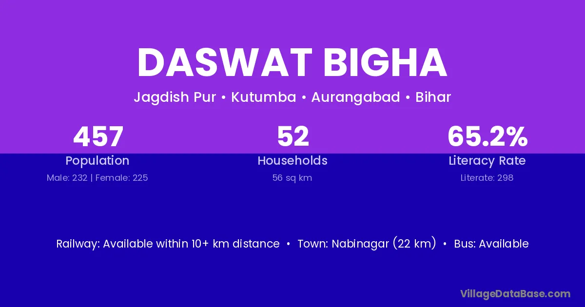 Nabinagar (22 km) is the nearest town to Daswat Bigha village for major economic activities and is located approximately 22 km away.