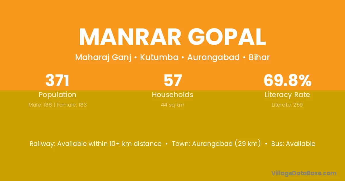 Aurangabad (29 km) is the nearest town to Manrar Gopal village for major economic activities and is located approximately 29 km away.