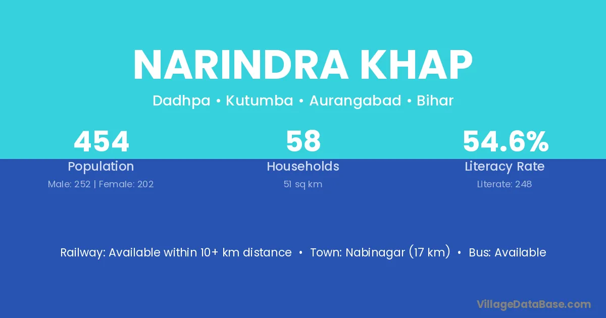 Nabinagar (17 km) is the nearest town to Narindra Khap village for major economic activities and is located approximately 17 km away.