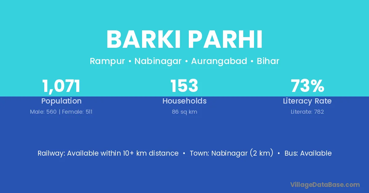 Nabinagar (2 km) is the nearest town to Barki Parhi village for major economic activities and is located approximately 2 km away.