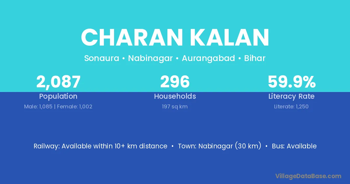 Nabinagar (30 km) is the nearest town to Charan Kalan village for major economic activities and is located approximately 30 km away.