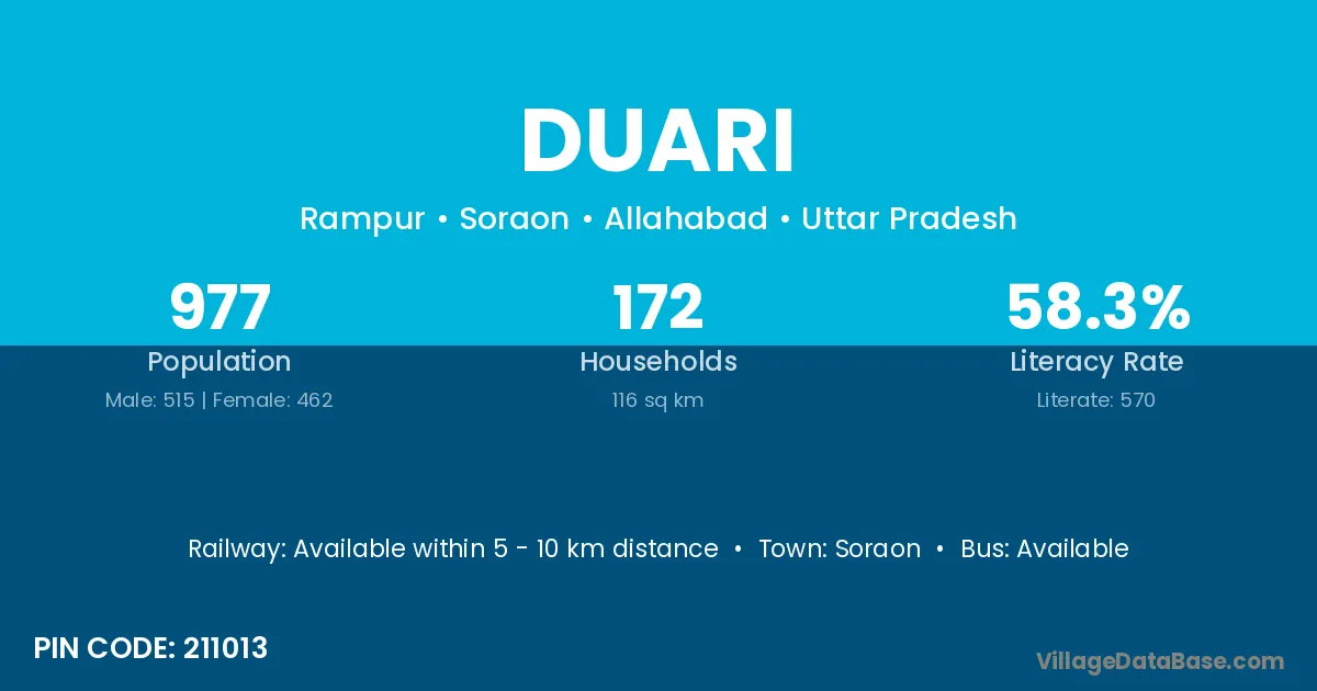 Nabinagar (9 km) is the nearest town to Duari village for major economic activities and is located approximately 9 km away.