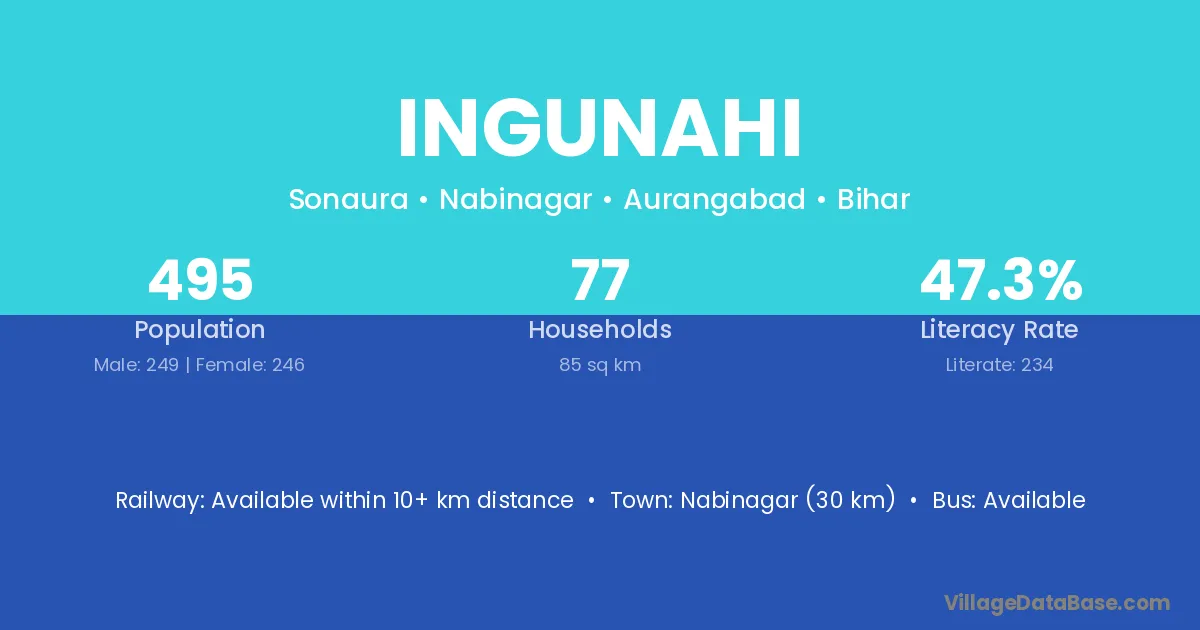 Nabinagar (30 km) is the nearest town to Ingunahi village for major economic activities and is located approximately 30 km away.