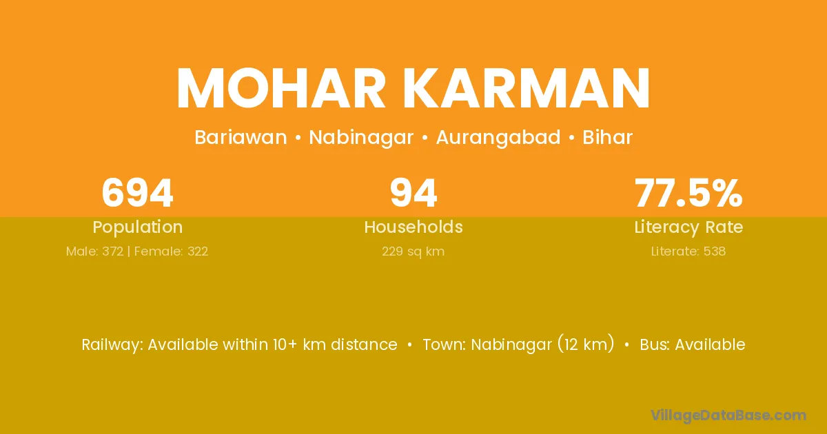 Nabinagar (12 km) is the nearest town to Mohar Karman village for major economic activities and is located approximately 12 km away.