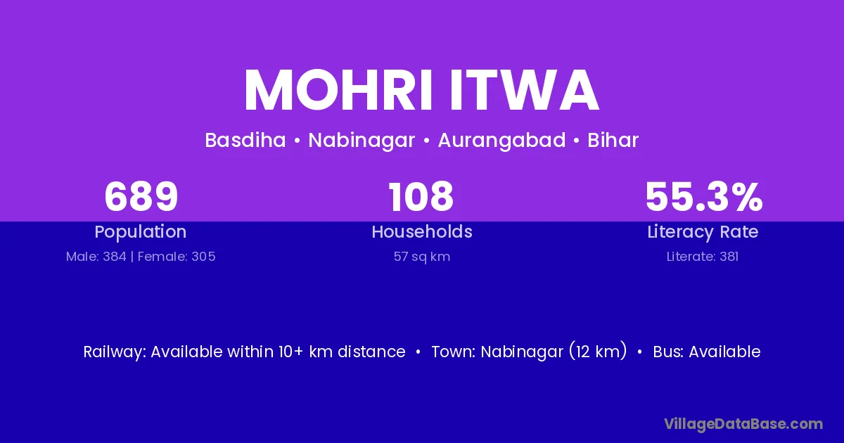 Nabinagar (12 km) is the nearest town to Mohri Itwa village for major economic activities and is located approximately 12 km away.