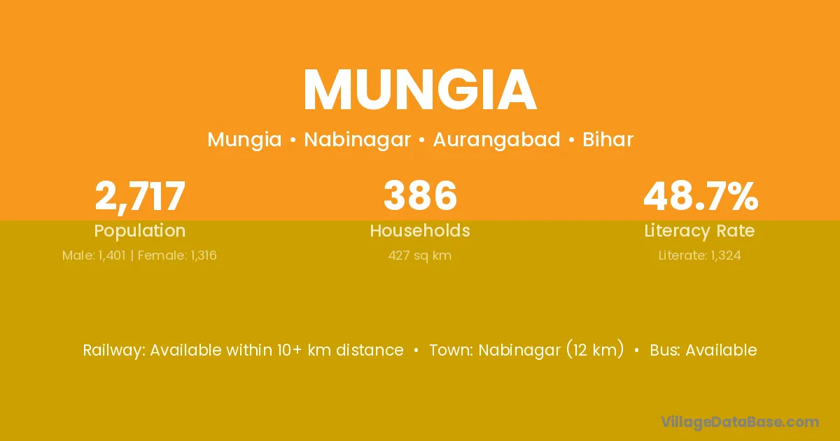 Nabinagar (12 km) is the nearest town to Mungia village for major economic activities and is located approximately 12 km away.