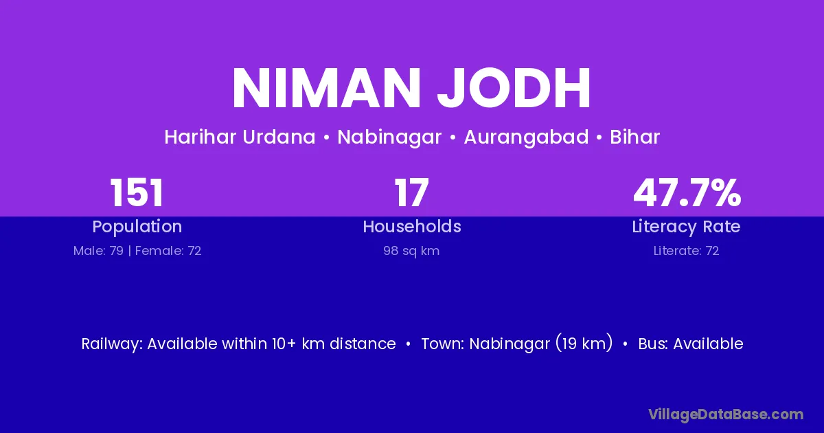 Nabinagar (19 km) is the nearest town to Niman Jodh village for major economic activities and is located approximately 19 km away.