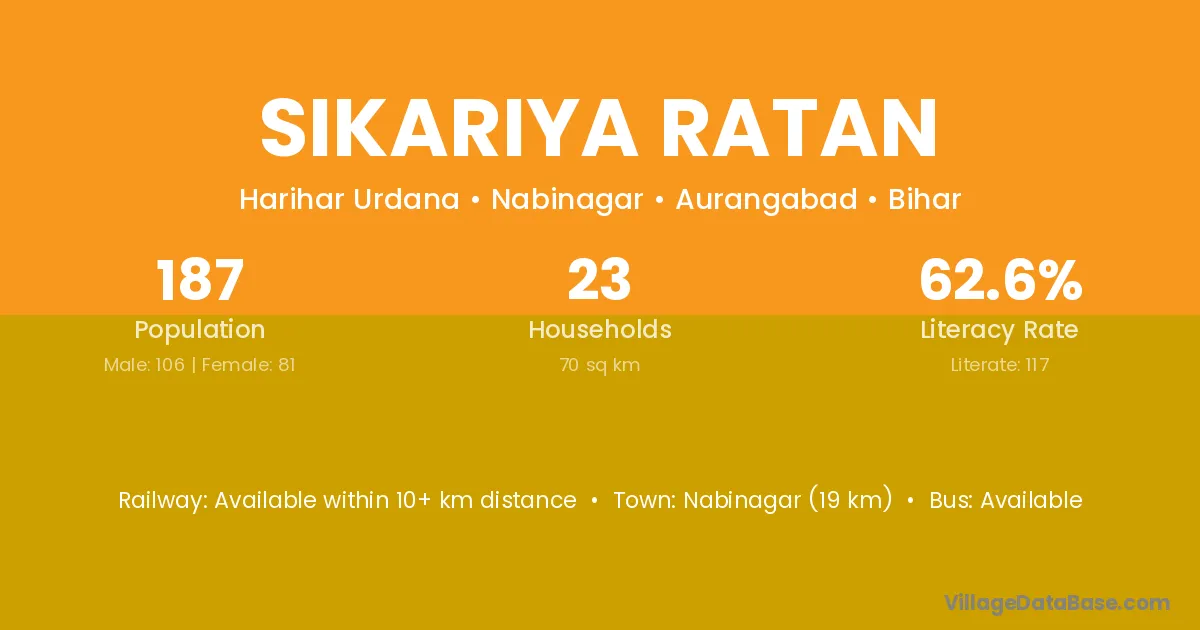 Sikariya Ratan village has a total population of 187 people, of which 106 are males and 81 are females.
