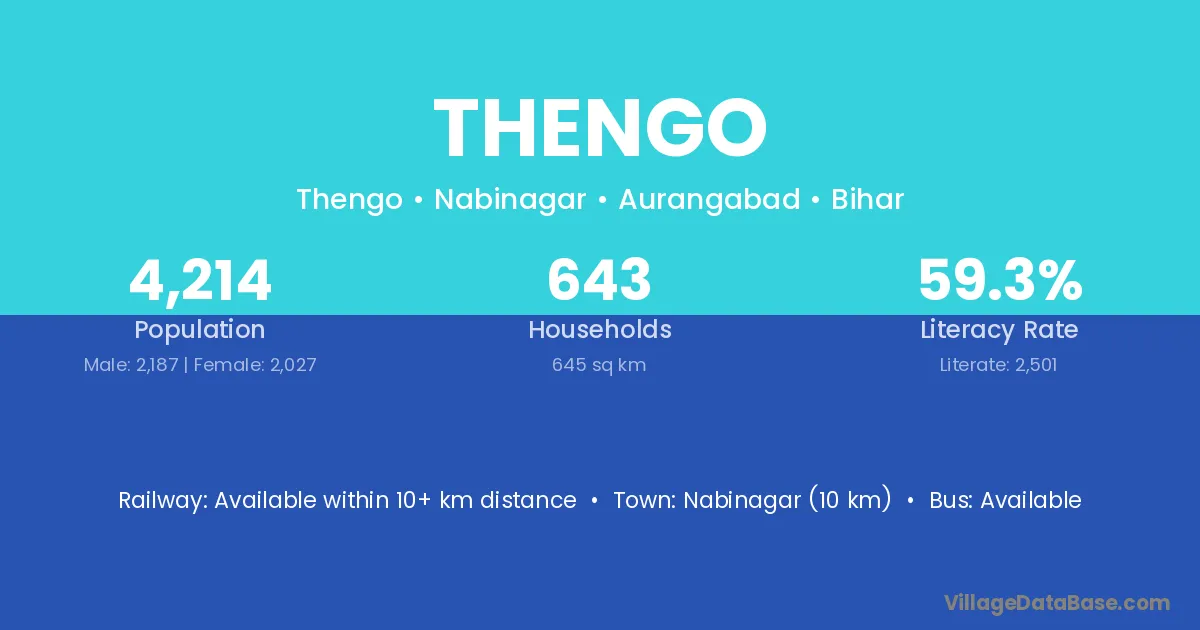 Nabinagar (10 km) is the nearest town to Thengo village for major economic activities and is located approximately 10 km away.