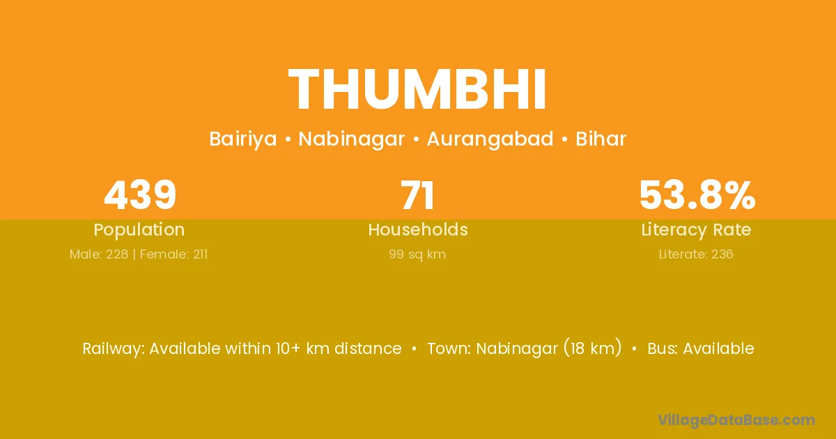 Nabinagar (18 km) is the nearest town to Thumbhi village for major economic activities and is located approximately 18 km away.