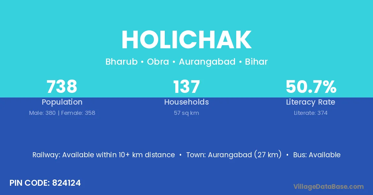 Aurangabad (27 km) is the nearest town to Holichak village for major economic activities and is located approximately 27 km away.