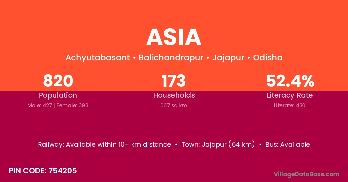 The literacy rate of Asia village is 42.02%. Male literacy stands at 55.67% and female literacy at 27.47%.