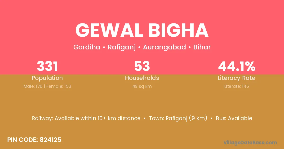 Gewal Bigha village has a total population of 331 people, of which 178 are males and 153 are females.
