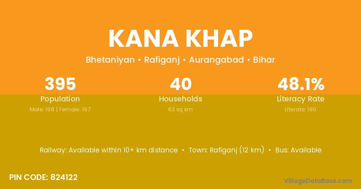 Rafiganj (12 km) is the nearest town to Kana Khap village for major economic activities and is located approximately 12 km away.