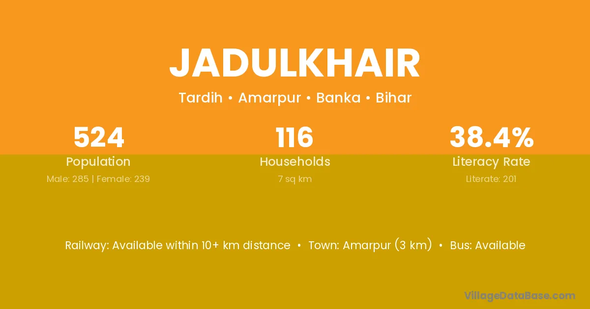 Jadulkhair village has a total population of 524 people, of which 285 are males and 239 are females.