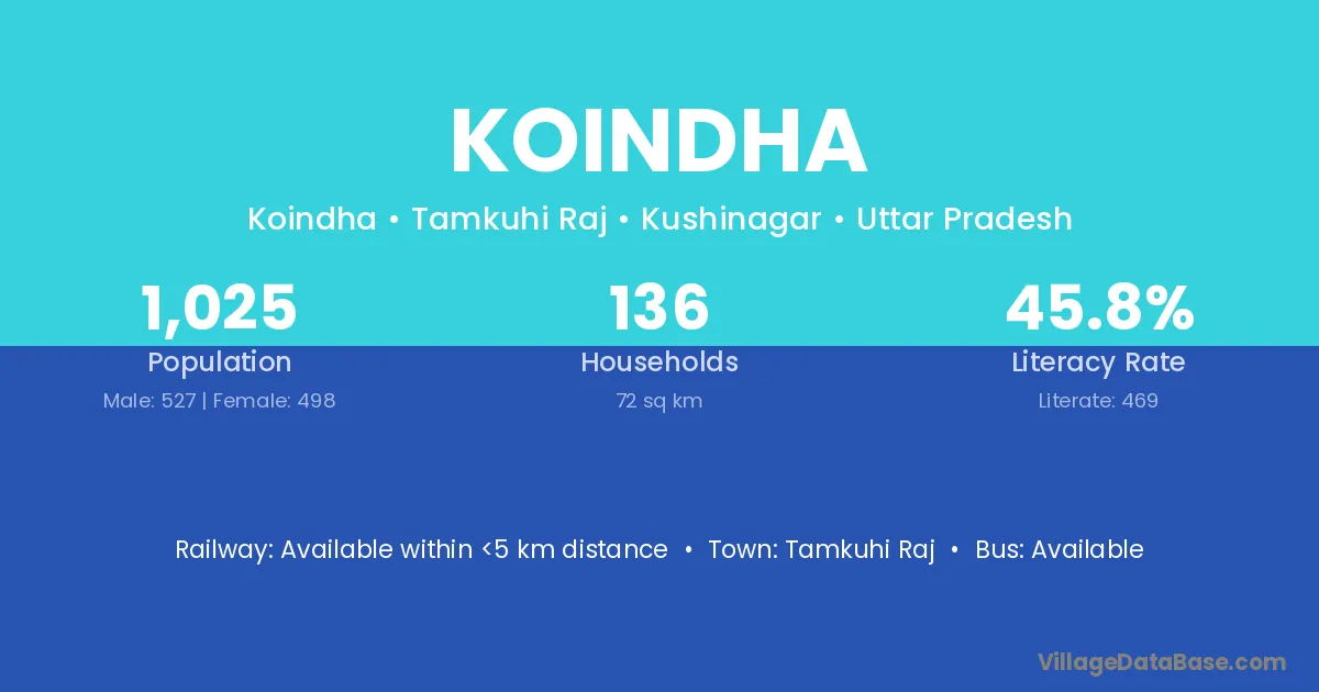 The literacy rate of Koindha village is 44.86%. Male literacy stands at 49.58% and female literacy at 39.84%.