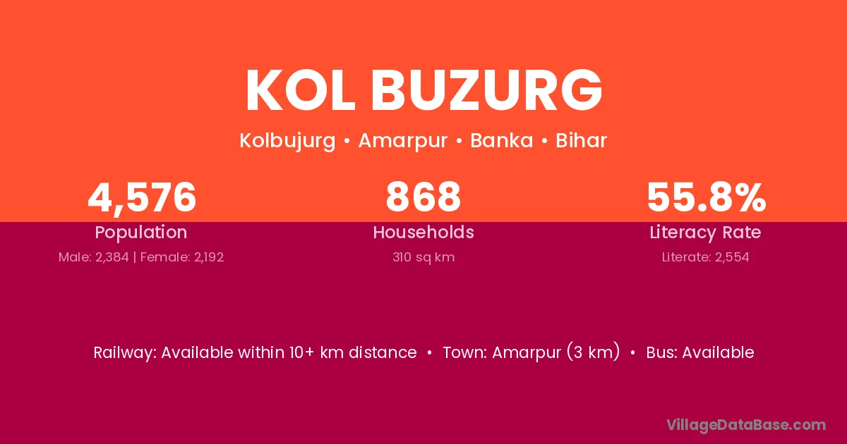 Amarpur (3 km) is the nearest town to Kol Buzurg village for major economic activities and is located approximately 3 km away.